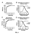 FIGS. 3A-3D show ROC curves and plot of sensitivity and specificity for the ovarian cancer validation panels I and II. Five malignant neoplasia biomarkers making up the validation panel I (3.1 kDa, 13.9 kDa, 21.0 kDa, 79.0 kDa, and 106.7 kDa) and four markers representing the validation panel II (5.1 kDa, 16.9 kDa, 28.0 kDa, and 93.0 kDa) were identified by the SAS multivariate analysis program. The areas under the ROC curves are 0.94 (3A) and 0.90 (3C). The weighted sum of the marker intensities (score/index) is plotted as a function of sensitivity and specificity (3B and 3D).