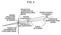 Also, in the method described in Uchiyama et al., when an “orientation” of a shooting viewpoint includes an error due to an error included in coordinates in the world coordinate system of a marker and projected coordinates of the marker, the registration accuracy in a space far from the shooting viewpoint relative to the marker is significantly lower than near the marker (see FIG. 3: a physical space three-dimensionally deviates from a virtual space significantly). On the other hand, when a “position” of a shooting viewpoint includes an error due to an error in coordinates in the world coordinate system of a marker and projected coordinates of the marker, the registration accuracy in a space close to the shooting viewpoint relative to the marker is significantly lower than near the marker (see FIG. 4: an image of a physical space two-dimensionally deviates from an image of a virtual space significantly). Therefore, whether a marker is placed near a space is a factor in determining the registration accuracy in the space.