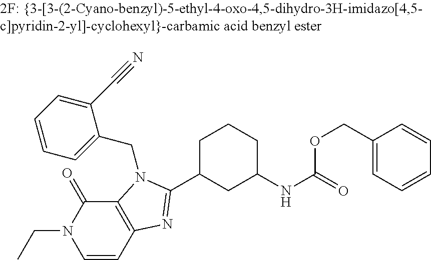 Step F: {3-[3-(2-Cyano-benzyl)-5-ethyl-4-oxo-4,5-dihydro-3H-imidazo[4,5-c]pyridin-2-yl]-cyclohexyl}-carbamic acid benzyl ester: To a solution of [3-(5-ethyl-4-oxo-4,5-dihydro-3H-imidazo[4,5-c]pyridin-2-yl)-cyclohexyl]-carbamic acid benzyl ester (0.1 g, 0.25 mmol) in DMF (3 mL) were added Cs2CO3 (0.17 g, 0.51 mmol) and 60 mg (0.30 mmol) of 2-cyanobenzyl bromide as a solution in 3 mL of DMF. After stirring at room temperature for 17 h, the reaction mixture was diluted with water (10 mL) then extracted with CH2Cl2. The combined extracts were dried with MgSO4, and concentrated in vacuo. The crude product was purified by flash chromatography, eluting with 1% MeOH in CH2CH2 to give {3-[3-(2-cyano-benzyl)-5-ethyl-4-oxo-4,5-dihydro-3H-imidazo[4,5-c]pyridin-2-yl]-cyclohexyl}-carbamic acid benzyl ester (70 mg, 54% yield). 1H-NMR (CDCl3): δ 7.73 (m, 1H), 7.49 (m, 1H), 7.34 (m, 6H), 7.13 (m, 1H), 6.89 (d, 1H, J=8.4 Hz), 6.69 (m, 1H), 6.19 (m, 1H), 5.94 (m, 1H), 5.06 (s, 2H), 4.73 (m, 1H), 4.07 (m, 2H), 3.58 (m, 1H), 2.79 (m, 1H), 2.02 (m, 2H), 1.87 (m, 1H), 1.68 (m, 2H), 1.51 (m, 2H), 1.38 (t, 3H, J=7.2 Hz), 1.16 (m, 1H). MS: calculated for C30H31N5O3+H 510.3; found: 510.5.