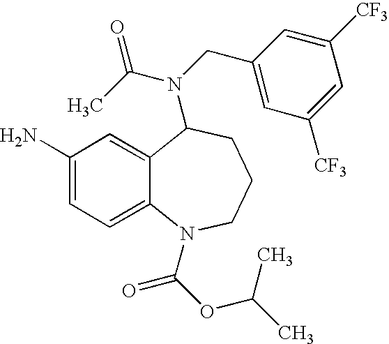 A mixture of 5-[Acetyl-(3,5-bis-trifluoromethyl-benzyl)-amino]-8-chloro-2,3,4,5-tetrahydro-benzo[b]azepine-1-carbonyl chloride (0.1 mmol, 50.0 mg) and ammonia (1.0 mmol, 1.0 mL, 1M in MeOH) was refluxed at 70° C. for 6 h with vigorous stirring. The solvent was removed in vacuo and the crude product was purified by crystallization using EtOAc. The product was obtained as a white solid; Rf 0.1 (EtOAc); MS (ES+): 508 (M+H+).