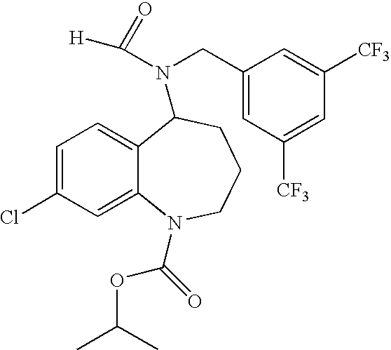 A mixture of 5-[Acetyl-(3,5-bis-trifluoromethyl-benzyl)-amino]-8-chloro-2,3,4,5-tetrahydro-benzo[b]azepine-1-carboxylic acid amide (0.1 mmol, 51 mg) and 85% dimethyl acetamide dimethylacetal (1.5 mmol, 0.22 mL) was heated at reflux for 1 h and then evaporated in vacuo. Dioxane (1 mL), hydroxylamine hydrochloride (0.2 mmol, 14 mg), acetic acid (0.4 mL), and a 2N NaOH (0.2 ml) solution were added and the mixture was stirred at room temperature for 2 h. Then the reaction mixture was refluxed for 1 h, cooled to room temperature and poured into ice water (10 mL). After the pH of the solution had been adjusted to 7-8 using 1 N NaOH, it was extracted with EtOAc (2×20 mL). The combined organic layers were dried over Na2SO4 and the solvent evaporated in vacuo. The pure compound was obtained by flash column chromatography (EtOAc-Hexane 1:1) to afford the title compound as colorless oil. Rf 0.6 (EtOAc-Hexane, 1:1, v/v); MS (ES+): 547 (M+H+).