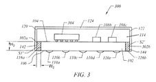 Referring to FIG. 1, the package 100 includes a substrate unit 102, which includes an upper surface 104, a lower surface 106, and lateral surfaces 142 and 144 disposed adjacent to sides of the substrate unit 102. In the illustrated embodiment, the lateral surfaces 142 and 144 are substantially planar and have a substantially orthogonal orientation with respect to the upper surface 104 or the lower surface 106, although it is contemplated that the shapes and orientations of the lateral surfaces 142 and 144 can vary for other implementations. The substrate unit 102 can be implemented in any of a number of ways, and includes electrical interconnect to provide electrical pathways between the upper surface 104 and the lower surface 106 of the substrate unit 102. The electrical interconnect can include, for example, a set of electrically conductive layers that are incorporated within a set of dielectric layers. The electrically conductive layers can be connected to one another by internal vias, and can be implemented so as to sandwich a core formed from a suitable resin, such as one based on bismaleimide and triazine or based on epoxy and polyphenylene oxide. For example, the substrate unit 102 can include a substantially slab-shaped core that is sandwiched by one set of electrically conductive layers disposed adjacent to an upper surface of the core and another set of electrically conductive layers disposed adjacent to a lower surface of the core. For certain implementations, a thickness of the substrate unit 102, namely a distance between the upper surface 104 and the lower surface 106 of the substrate unit 102, can be in the range of about 0.3 millimeter (“mm”) to about 3 mm, such as from about 1.5 mm to about 2.5 mm or from about 1.7 mm to about 2.3 mm. While not illustrated in FIG. 1, it is contemplated that a solder mask layer can be disposed adjacent to either, or both, the upper surface 104 and the lower surface 106 of the substrate unit 102.