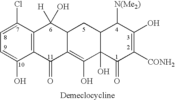 - Table I depicts tetracycline and several known tetracycline derivatives.