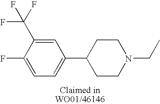 Extractions procedure: Plasma samples (0.25-0.5 ml) were diluted with water to 1 ml, and 60 pmol (100 μl) internal standard (−)-OSU6241 was added. The pH was adjusted to 11 by the addition of 25 μl saturated Na2CO3. After mixing, the samples were extracted with 4 ml dichloromethane by shaking for 20 min. The organic layer was after centrifugation transferred to a smaller tube and evaporated to dryness under a stream of nitrogen. The residue was then dissolved in 120 μl mobile phase (acetic acid (0.03%): acetonitrile, 95:5) for LC-MS analysis (10 μl injected). The selective ion (MH+) was monitored for each Example, and MH+ 296 for (−)-OSU6241 ((3-[3-(ethylsulfonyl)phenyl]-1-propylpiperidine). A standard curve over the range of 1-500 pmol is prepared by adding appropriate amounts of test compound to blank plasma samples.