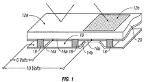 With no applied voltage, the gap 19 remains between the movable reflective layer 14 a and optical stack 16 a, with the movable reflective layer 14 a in a mechanically relaxed state, as illustrated by the pixel 12 a in FIG. 1. However, when a potential difference is applied to a selected row and column, the capacitor formed at the intersection of the row and column electrodes at the corresponding pixel becomes charged, and electrostatic forces pull the electrodes together. If the voltage is high enough, the movable reflective layer 14 is deformed and is forced against the optical stack 16. A dielectric layer (not illustrated in this Figure) within the optical stack 16 may prevent shorting and control the separation distance between layers 14 and 16, as illustrated by pixel 12 b on the right in FIG. 1. The behavior is the same regardless of the polarity of the applied potential difference. In this way, row/column actuation that can control the reflective vs. non-reflective pixel states is analogous in many ways to that used in conventional LCD and other display technologies.