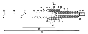 With continued reference to FIGS. 4A-4C, the collection tube 18 is axially disposed in the lumen 42 of the vent tube 16. A gap separates the exterior of the collection tube 18 from the wall of the vent tube 16. Typically, the gap is uniform along the length of the vent tube 16. The collection tube 18 has a first end 52, a second end 54, a lumen 56, a wall 58, and a length 60. The first end 52 typically includes a beveled opening 53 in communication with the lumen 56 and terminates with a point, i.e., a tip having an acute angle. The first end 52 of the collection tube 18 is positioned outside of the lumen 42 of the vent tube 16 at a fixed distance beyond the first end 46 of the vent tube 16. The second end 54 of the collection tube 18 is positioned at a fixed distance from the second end 48 of the vent tube 16 within the channel 32 (see FIG. 2) of the elongate body sub-assembly 12. The second end 54 includes an opening 55 in fluid communication with the lumen 56 and is positioned adjacent to and in fluid communication with the second chamber 34.