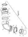- the invention resides in a patient gas delivery apparatus including a mask adapted for communication with a patient's airways, a gas flow generator and gas delivery conduit means, further including an assembly connected in series between the conduit means and the mask, said assembly being formed in at least two parts connected by interengaging connecting means, said assembly further including means for connection to the mask, wherein connection of the assembly to the mask prevents disengagement of the interengaging connecting means such that said at least two parts of the assembly cannot separate whilst the assembly is connected to the mask.