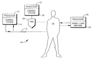 - One or both of the primary control systems 14 , 20 may be used during, e.g., a surgical procedure such as cardiac bypass surgery that might employ a component such as but not limited to a heart-lung machine (HLM) 24 with component processor 26 that happens to control blood temperature extracorporeally, in addition to other functions it might perform such as blood oxygenation. During some of these procedures it might happen to be desirable to cool the patient to temperatures (e.g., fifteen degrees Centigrade) far lower than those normally used for therapeutic hypothermia (e.g., mild hypothermia temperatures). As recognized herein, one or both of the primary control systems 14 , 20 can be used to assist the HLM 24 in lowering patient temperature. It should be understood that while for simplicity the discussion below relates to using only the primary control system 14 with catheter 12 to assist the HLM 24 , one or both of the primary control systems 14 , 20 can be used to assist the HLM 24 .