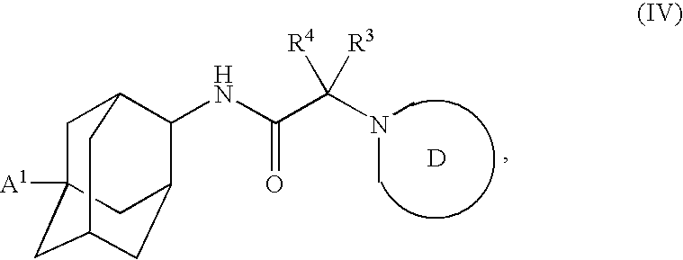 11β-HSD-1 is expressed in mammalian brain, and published data indicates that glucocorticoids may cause neuronal degeneration and dysfunction, particularly in the aged (de Quervain et al.; Hum Mol Genet. 13: 47-52, 2004; Belanoff et al. J. Psychiatr Res. 35: 127-35, 2001). Evidence in rodents and humans suggests that prolonged elevation of plasma glucocorticoid levels impairs cognitive function that becomes more profound with aging. (See, A. M. Issa et al., J. Neurosci., 10:3247-3254, 1990, S. J. Lupien et. al., Nat. Neurosci., 1:69-73 1998, J. L. Yau et al., Neuroscience, 66: 571-581, 1995). Chronic excessive cortisol levels in the brain may result in neuronal loss and neuronal dysfunction. (See, D. S. Kerr et al., Psychobiology 22: 123-133, 1994, C. Woolley, Brain Res. 531: 225-231, 1990, P. W. Landfield, Science, 272: 1249-1251, 1996). Furthermore, glucocorticoid-induced acute psychosis exemplifies a more pharmacological induction of this response, and is of major concern to physicians when treating patients with these steroidal agents (Wolkowitz et al.; Ann NY Acad Sci. 1032: 191-4, 2004). Thekkapat et al have recently shown that 11β-HSD-1 mRNA is expressed in human hippocampus, frontal cortex and cerebellum, and that treatment of elderly diabetic individuals with the non-selective 11β-HSD-1 and 11β-HSD-2 inhibitor carbenoxolone improved verbal fluency and memory (Proc Natl Acad Sci USA. 101: 6743-9, 2004). Therefore, administration of a therapeutic dose of an 11β-HSD-1 inhibitor may reduce, ameliorate, control and/or prevent the cognitive impairment associated with aging, neuronal dysfunction, dementia, and steroid-induced acute psychosis.