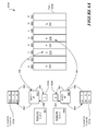 FIGS. 4C-6B depict operation of implementations of lockless atomic updating in a one-dimensional table. (FIGS. 7A-8B illustrate operation of implementations of lockless atomic updating in a two-dimensional table.) In these examples, operations to read from or write to one of the tables or buffers are represented by arrows labeled with reference numbers. The following description uses the reference numbers to refer to the operations depicted by the arrows.