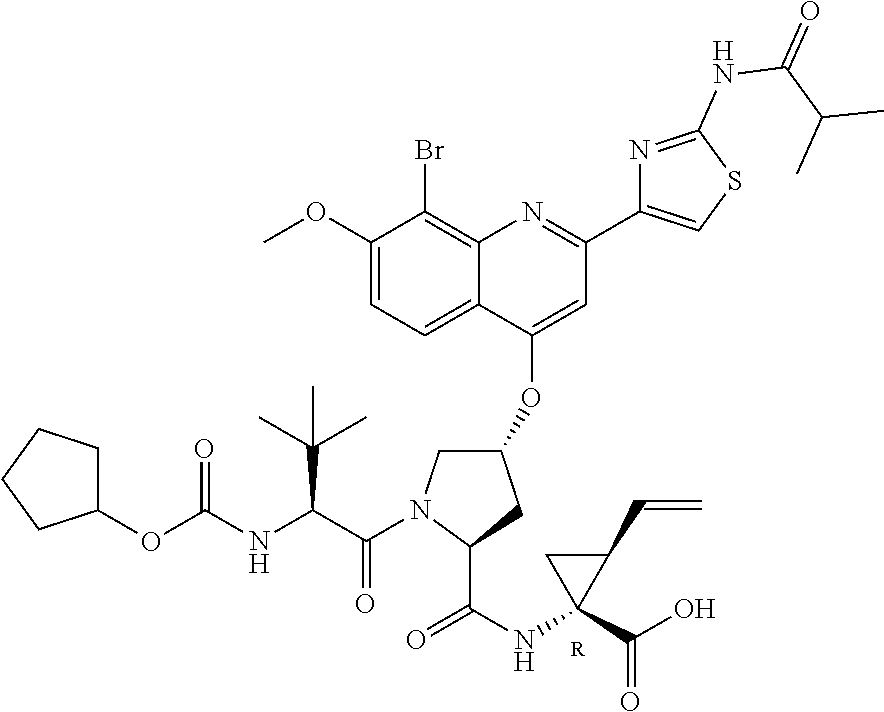 The term “inhibitor of HCV NS3 protease” as used herein means an agent (compound or biological) that is effective to inhibit the function of HCV NS3 protease in a mammal. Inhibitors of HCV NS3 protease include, for example, those compounds described in WO 99/07733, WO 99/07734, WO 00/09558, WO 00/09543, WO 00/59929, WO 03/064416, WO 03/064455, WO 03/064456, WO 02/060926, WO 03/053349, WO 03/099316 or WO 03/099274, and the Vertex pre-development candidate identified as VX-950.
