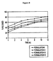 FIG. 8 is a graph demonstrating the dissolution profiles of four sustained release tablets of the present invention: one tablet is non-layered, comprising 1200 mg of sustained release formulation; another tablet is bi-layered, comprising 600 mg of sustained release formulation and 600 mg of immediate release formulation; another tablet is bi-layered, comprising 800 mg of sustained release formulation and 400 mg of immediate release formulation; and yet another tablet is bi-layered comprising 1000 mg of sustained release formulation and 200 mg of immediate release formulation.