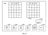 FIG. 31 is an exemplary display 1200 that may be shown on the display unit 170 during performance of a bingo routine 1220. Referring to FIG. 31, the display 1200 may include one or more video images 1202 of a bingo card and images of the bingo numbers selected during the game. The bingo card images 1202 may have a grid pattern.
