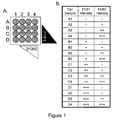 FIG. 1 provides an exemplary cell FCB stain and detection scheme. In panel A, 16 different cell samples are arrayed in a 4×4 culture plate and contacted to distinct concentrations of FCB1 and FCB2 labels (indicated in the bottom and right of the plate, where the depth of the triangle indicates the concentration of each label). Note that no FCB1 label is added to the cells in row A and no FCB2 label is added to the cells in column 1. As such, one distinguishing characteristic of an FCB label may be its absence. While not shown in this example, there are myriad ways to label cells with FCB markers such that each cell can be categorized upon multiplex analysis. Further, staining procedures can include one or more control samples (e.g., samples that should have identical FCB labels present in different wells as a staining control).