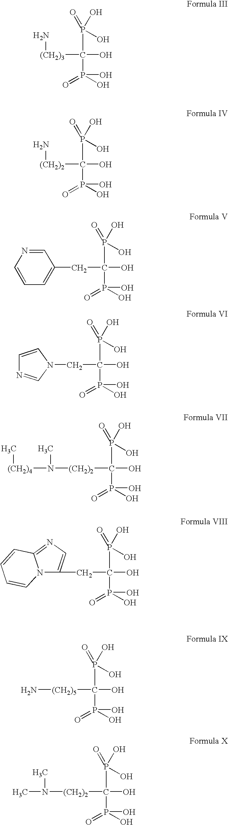 The term “RRT” is used herein to indicate the relative retention time of the particular impurity against pure alendronate sodium standard (assigned an RRT value of 1.0) during an HPLC analysis. A relative standard deviation that is equal to or less than 5% for a population of 6 injections is acceptable while referring to RRT values.