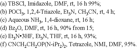 The compounds (e.g., bicyclic nucleosides) described herein can be prepared by any of the applicable techniques of organic synthesis, as, for example, illustrated in the examples below. Many such techniques are well known in the art. However, many of the known techniques are elaborated in Compendium of Organic Synthetic Methods (John Wiley & Sons, New York) Vol. 1, Ian T. Harrison and Shuyen Harrison (1971); Vol. 2, Ian T. Harrison and Shuyen Harrison (1974); Vol. 3, Louis S. Hegedus and Leroy Wade (1977); Vol. 4, Leroy G. Wade Jr., (1980); Vol. 5, Leroy G. Wade Jr. (1984); and Vol. 6, Michael B. Smith; as well as March, J., Advanced Organic Chemistry, 3rd Edition, John Wiley & Sons, New York (1985); Comprehensive Organic Synthesis. Selectivity, Strategy & Efficiency in Modern Organic Chemistry, In 9 Volumes, Barry M. Trost, Editor-in-Chief, Pergamon Press, New York (1993); Advanced Organic Chemistry, Part B: Reactions and Synthesis, 4th Ed.; Carey and Sundberg; Kluwer Academic/Plenum Publishers: New York (2001); Advanced Organic Chemistry, Reactions, Mechanisms, and Structure, 2nd Edition, March, McGraw Hill (1977); Protecting Groups in Organic Synthesis, 2nd Edition, Greene, T. W., and Wutz, P. G. M., John Wiley & Sons, New York (1991); and Comprehensive Organic Transformations, 2nd Edition, Larock, R. C., John Wiley & Sons, New York (1999).