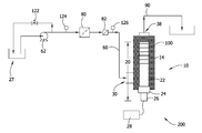- the system 200 is configured such that fluid enters the treatment chamber 10 generally at the inlet end 30 thereof, flows generally longitudinally within the chamber 10 (e.g., upward in the orientation of the illustrated embodiment) and exits the chamber 10 generally at the outlet end 38 of the chamber 10 .