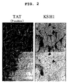 Regarding novel PTD sequence, each peptide was analyzed in a series of 2-fold dilutions at three levels from 50 μM to 12.5 μM. As a result, the results of the confocal microscopic analysis showed the same tendency as the results of the FACS analysis. For the four kinds of KSH2, KSH3, KSH4, KSH6, KSH7 and KSH10, the results of the confocal microscopic analysis, like the FACS analysis, revealed better intracellular translocation profiles than PTD1 (FIG. 19, the upper panels show the fluorescence of fluorescence-labeled peptides translocated into cells; the lower panels show differential interference microscopic images of cells in combination with fluorescence images; the peptide addition concentration was 25 μM). The PTD candidate sequences identified here clearly retained the capability of intracellular translocation. When database search was performed, no homologous sequences were observed; all were found to be novel PTD sequences. Regarding KSH2, the peptide was localized as fringing the surface of the cell membrane in HeLa cells, showing a transferability pattern different from that of other PTDs.