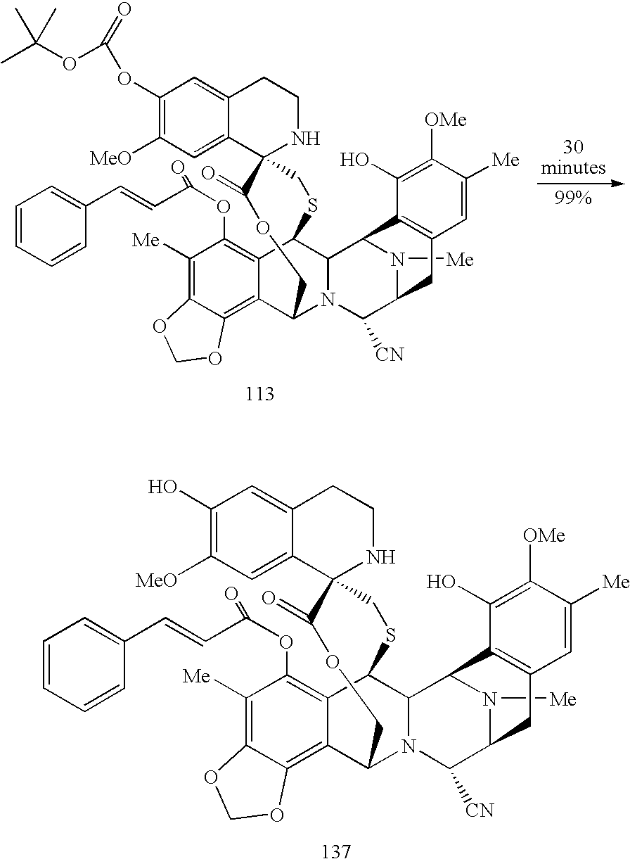See also: Corey, E. J., J. Am. Chem. Soc. 1996, 118, 9202-9203; Rinehart, et al., Journal of National Products 1990, “Bioactive Compounds from Aquatic and Terrestrial Sources”, 53, 771-792; Rinehart et al., Pure and Appl. Chem. 1990, “Biologically active natural products”, 62, 1277-1280; Rinehart, et al., J. Org. Chem. 1990, “Ecteinascidins 729, 743, 745, 759A, 759B, and 770: Potent Antitumor Agents from the Caribbean Tunicate Ecteinascidia turbinatd”, 55, 4512-4515; Wright et al., J. Org. Chem. 1990, “Antitumor Tetrahydroisoquinoline Alkaloids from the Colonial Ascidian Ecteinascidia turbinata”, 55, 4508-4512; Sakai et al., Proc. Natl. Acad. Sci. USA 1992, “Additional antitumor ecteinascidins from a Caribbean tunicate: Crystal structures and activities in vivo”, 89, 11456-11460; Science 1994, “Chemical Prospectors Scour the Seas for Promising Drugs”, 266, 1324; Koenig, K. E., “Asymmetric Synthesis”, ed. Morrison, Academic Press, Inc., Orlando, Fla., vol. 5, 1985, pp. 71; Barton, et al., J. Chem Soc. Perkin Trans. I 1982, “Synthesis and Properties of a Series of Sterically Hindered Guandidine Bases”, 2085; Fukuyama et al., J. Am Chem. Soc. 1982, “Stereocontrolled Total Synthesis of (+)—Saframycin B”, 104, 4957; Fukuyama et al., J. Am Chem Soc. 1990, “Total Synthesis of (+)—Saframycin A”, 112, 3712; Saito, et al., J. Org. Chem. 1989, “Synthesis of Saframycins. Preparation of a Key Tricyclic Lactam Intermediate to Saframycin A”, 54, 5391; Still, et al., J. Org. Chem. 1978, “Rapid Chromatographic Technique for Preparative Separations with Moderate Resolution”, 43, 2923; Kofron, W. G.; Baclawski, L. M., J. Org. Chem. 1976, 41, 1879; Guan et al., J. Biomolec. Struc. & Dynam. 1993, 10, 793-817; Shamma et al., “Carbon-13 NMR Shift Assignments of Amines and Alkaloids”, p. 206, 1979; Lown et al., Biochemistry 1982, 21, 419-428 ; Zmijewski et al., Chem. Biol. Interactions 1985, 52, 361-375; Ito, CRC CRIT. Rev. Anal. Chem. 1986, 17, 65-143; Rinehart et al., “Topics in Pharmaceutical Sciences 1989” pp. 613-626, D. D. Breimer, D. J. A. Cromwelin, K. K. Midha, Eds., Amsterdam Medical Press B. V., Noordwijk, The Netherlands (1989); Rinehart et al., “Biological Mass Spectrometry,” 233-258 eds. Burlingame et al., Elsevier Amsterdam (1990); Guan et al., Jour. Biomolec. Struct. & Dynam. 1993, 10, 793-817; Nakagawa et al., J. Amer. Chem. Soc. 1989, 111: 2721-2722; Lichter et al., “Food and Drugs from the Sea Proceedings” (1972), Marine Technology Society, Washington, D.C. 1973, 117-127; Sakai et al., J. Amer. Chem. Soc. 1996, 118, 9017; Garcia-Rocha et al., Brit. J. Cancer 1996, 73: 875-883; Pommier et al., Biochemistry 1996, 35: 13303-13309; Rinehart, K. L. Med. Res. Rev. 2000, 20, 1-27 and Manzanares I. et al. Org. Left. 2000, 2 (16), 2545-2548; Corey et al., Proc. Natl. Acad. Sci. USA 1999, 96, 3496-3501.