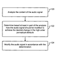 FIG. 1B is a flow chart illustrating a process used in one embodiment to modify an audio signal to achieve a desired change in a high-order perceptual attribute of the audio signal as rendered, as in step 104 of FIG. 1A. In step 120, the content of the audio signal is analyzed. In some embodiments, step 120 may comprise analyzing the signal in the time domain, the frequency domain, and/or a time-frequency domain. In step 122, it is determined based at least in part on the analysis performed in step 120 how the audio signal should be modified to achieve the desired change in the high-order perceptual attribute. In some embodiments, step 122 may comprise determining the value of a modification factor, exponent, or other coefficient, variable, or parameter based at least in part on the analysis performed in step 120. In step 124, the audio signal is modified in accordance with the determination made in step 122.
