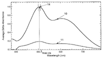 For example, with reference to FIG. 1, there is shown the average difference absorption spectrum (generally indicated 10) in one polarization plane that was obtained for a coating according to one embodiment disclosed herein. The average absorption spectrum (generally indicated 11) is the average difference absorption spectrum obtained for the same coating in the orthogonal polarization plane.