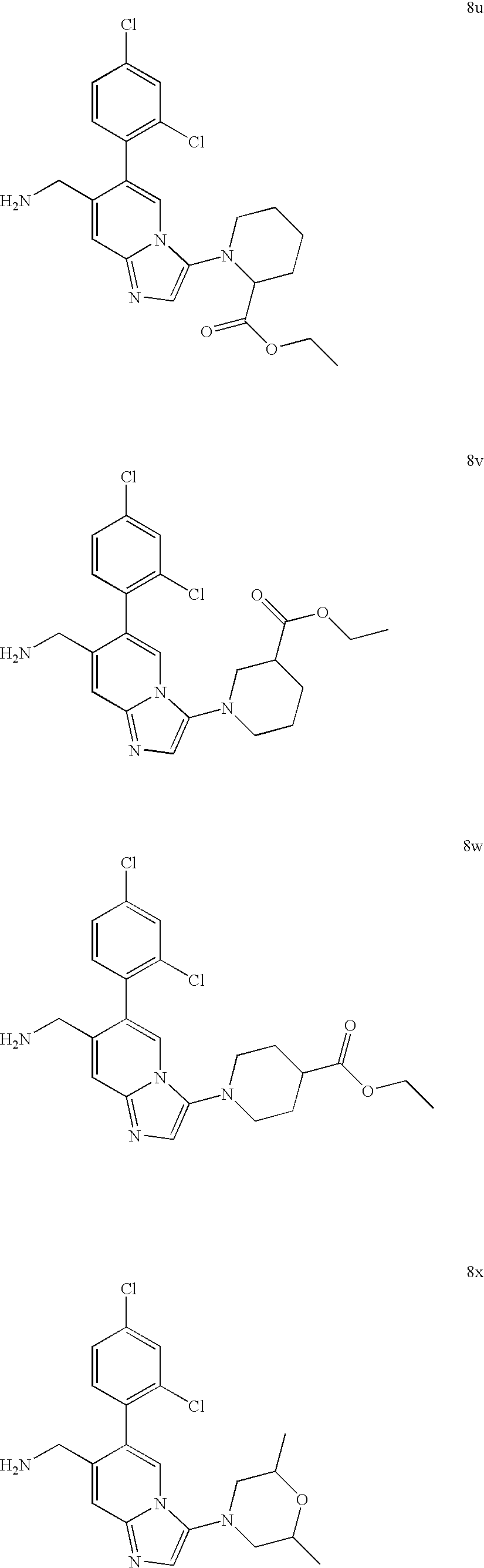- LSCKNOXEWPNDFP-UHFFFAOYSA-N CC1=CC=CC(C2=CN=C3C=C(CN)C(C4=C(Cl)C=C(Cl)C=C4)=CN23)=C1.NCC1=CC2=NC=C(C3=CC(F)=CC=C3)N2C=C1C1=C(Cl)C=C(Cl)C=C1.NCC1=CC2=NC=C(C3=CC=CC=C3)N2C=C1C1=C(Cl)C=C(Cl)C=C1.NCC1=CC2=NC=CN2C=C1C1=C(F)C=C(F)C(F)=C1 Chemical compound CC1=CC=CC(C2=CN=C3C=C(CN)C(C4=C(Cl)C=C(Cl)C=C4)=CN23)=C1.NCC1=CC2=NC=C(C3=CC(F)=CC=C3)N2C=C1C1=C(Cl)C=C(Cl)C=C1.NCC1=CC2=NC=C(C3=CC=CC=C3)N2C=C1C1=C(Cl)C=C(Cl)C=C1.NCC1=CC2=NC=CN2C=C1C1=C(F)C=C(F)C(F)=C1 LSCKNOXEWPNDFP-UHFFFAOYSA-N 0.000 description 2