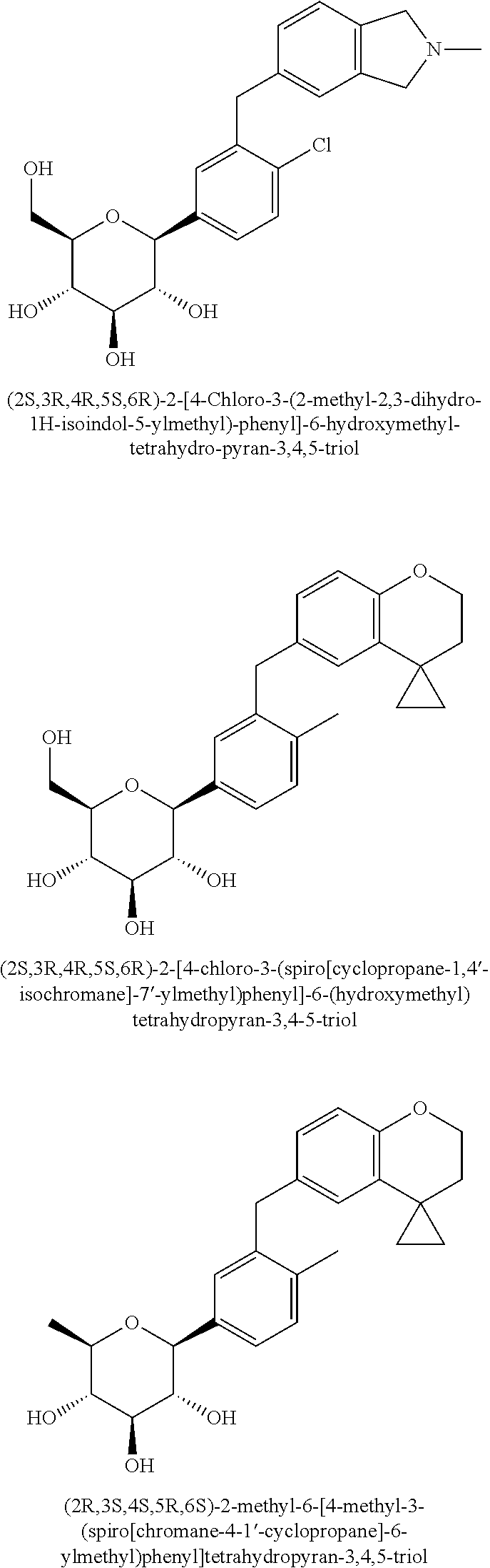 SGLT belongs to the sodium/glucose co-transporter family SLCA5. Two different SGLT isoforms, SGLT1 and SGLT2, have been identified to mediate renal tubular glucose reabsorption in humans [Curr. Opinon in Investigational Drugs (2007): 8(4), 285-292 and references cited herein]. Both of them are characterized by their different substrate affinity. Although both of them show 59% homology in their amino acid sequence, they are functionally different. SGLT1 transports glucose as well as galactose, and is expressed both in the kidney and in the intestine, while SGLT2 is found exclusively in the S1 and S2 segments of the renal proximal tubule. As a consequence, glucose filtered in the glomerulus is reabsorbed into the renal proximal tubular epithelial cells by SGLT2, a low-affinity/high-capacity system, residing on the surface of epithelial cell lining in S1 and S2 tubular segments. Much smaller amounts of glucose are recovered by SGLT1, as a high-affinity/low-capacity system, on the more distal segment of the proximal tubule. In healthy human, more than 99% of plasma glucose that is filtered in the kidney glomerulus is reabsorbed, resulting in less than 1% of the total filtered glucose being excreted in urine. It is estimated that 90% of total renal glucose absorption is facilitated by SGLT2; remaining 10% is likely mediated by SGLT1 [J. Parenter. Enteral Nutr. 2004, 28, 364-371].