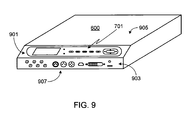 It will be appreciated that the present invention is not restricted to a specific form factor. Accordingly, the embodiment illustrated in FIGS. 6 and 7 is simply an exemplary embodiment. FIG. 6 is a front view of device 600, this portion of the housing including the device connection ports. Preferably all connection ports comply with industry standards, thus insuring device compatibility. As previously noted, the device can include any of a variety of high speed and medium speed I/O ports. In the illustrated embodiment, the system includes six HD-SDI inputs 601 and a pair of AES ports 603/604. In at least one embodiment, device 600 includes an internal battery. Alternately, device 600 can rely solely on external power sources such as external battery packs, line voltage, etc. In the illustrated embodiment, device 600 includes a port 605 that can be used to couple the device to an external power source and/or recharge an internal battery, if used. Preferably the device also includes an Ethernet port 607, a PCIe Link 609, and a pair of USB 2.0 ports 611/612.
