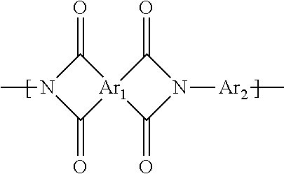 - Ar 1 and Ar 2 independently represent an aromatic group of from about 6 carbon atoms to about 60 carbon atoms; and at least one of Ar 1 and Ar 2 further contains a fluoro-pendant group, and wherein the fluorinated polyimide includes a segment containing an active site capable of reacting with the curing agent.
