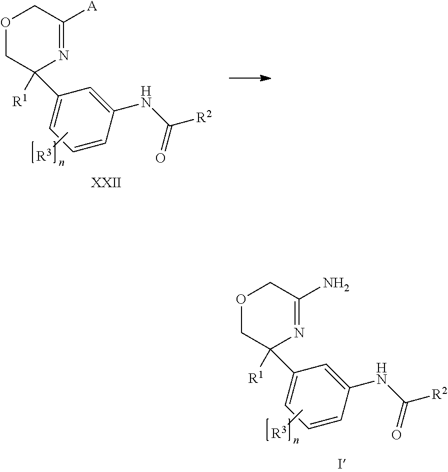 With 2,2,3,3-tetrafluoro-propionic acid the N-[3-((R)-5-amino-3-methyl-3,6-dihydro-2H-[1,4]oxazin-3-yl)-4-fluoro-phenyl]-2,2,3,3-tetrafluoro-propionamide formate (83) as a colorless amorphous material. Mass (calculated) C14H14F5N3O2.CH2O2 [397.300]; (found) [M+H]+=352.