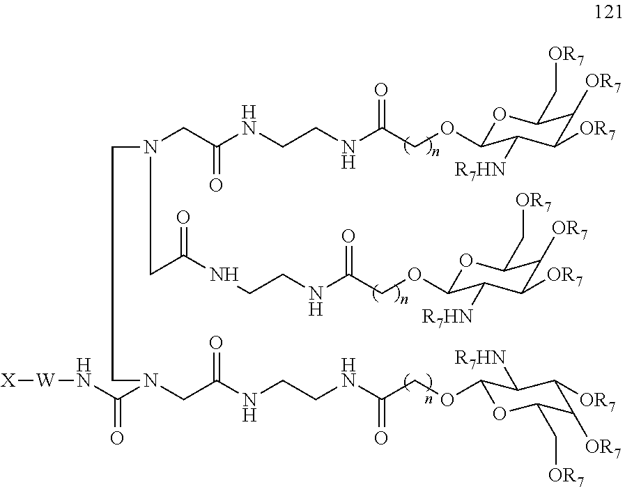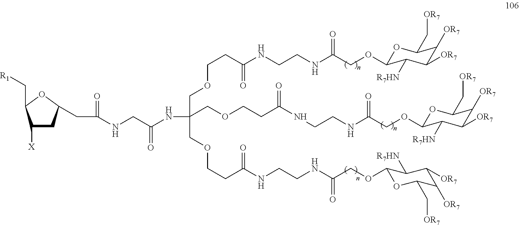 In another embodiment, a siNA molecule of the invention comprises at least one (e.g., about 1, 2, 3, 4, 5, 6, 7, 8, 9, 10, or more) substituted polyalkyl moieties, for example a compound having Formula VII: