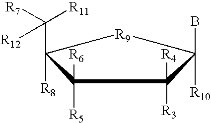 wherein each R3, R4, R5, R6, R7, R8, R10, R11 and R12 is independently H, OH, alkyl, substituted alkyl, alkaryl or aralkyl, F, Cl, Br, CN, CF3, OCF3, OCN, O-alkyl, S-alkyl, N-alkyl, O-alkenyl, S-alkenyl, N-alkenyl, SO-alkyl, alkyl-OSH, alkyl-OH, O-alkyl-OH, O-alkyl-SH, S-alkyl-OH, S-alkyl-SH, alkyl-S-alkyl, alkyl-O-alkyl, ONO2, NO2, N3, NH2, aminoalkyl, aminoacid, aminoacyl, ONH2, O-aminoalkyl, O-aminoacid, O-aminoacyl, heterocycloalkyl, heterocycloalkaryl, aminoalkylamino, polyalklylamino, substituted silyl, or group having Formula I; R9 is O, S, CH2, S═O, CHF, or CF2, and B is a nucleosidic base such as adenine, guanine, uracil, cytosine, thymine, 2-aminoadenosine, 5-methylcytosine, 2,6-diaminopurine, or any other non-naturally occurring base that can be employed to be complementary or non-complementary to target RNA or a non-nucleosidic base such as phenyl, naphthyl, 3-nitropyrrole, 5-nitroindole, nebularine, pyridone, pyridinone, or any other non-naturally occurring universal base that can be complementary or non-complementary to target RNA.