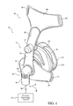 Referring again to FIGS. 1-6, faceplate 36 includes a seal support portion, generally indicated at 40, to which seal member 38 is mounted. An orifice 42 is provided in seal support portion 40 of faceplate 36 to enable a flow of gas from patient circuit 34 to be communicated to a chamber 44 defined by the seal member of the patient interface. Gas is also communicated in the opposite direction, i.e., from the interior of the patient interface to the patient circuit, through orifice 42. The flow of gas between the seal member and the patient circuit is illustrated by arrow A in FIG. 4.