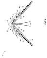 - FIG. 4 is a diagrammatical illustration of an alternative embodiment of the photovoltaic ridge cap structure, wherein three rows of photovoltaic modules are disposed on each side of the roof structure about the ridge, and the photovoltaic modules are offset from the light directing or concentrating portion of the cap structure;
