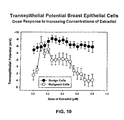FIG. 9 demonstrates measurements of cell membrane potential (Ψ) in human breast epithelial cells. Measurements were made using a potentiometric fluorescent probe, and ratiometric measurements, which are calibrated using valinomycin and K+-gradients. Ψs were measured in the presence (closed circles) and absence (open circles) of estradiol (the active metabolite of estrogen). Each symbol is the mean measurement. The upper error bar is the standard error of the mean, and the lower error bar is the 95% confidence level for the observations. The addition of estrogen to cultured breast epithelial cells results in an instantaneous increase in Ψ (data not shown) as well as transepithelial potential see FIG. 10. Transepithelial potential (VT) of an epithelium is the sum of the apical (luminal) cell membrane potential (VA) and the basolateral (abluminal) cell membrane potential (VBL). Therefore VT=VA+VBL (changes in VA and VBL will therefore alter VT or transepithelial potential).