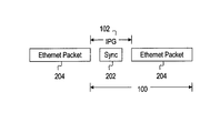 FIG. 3 also illustrates the placement of the Sync 202 within the IPG 102. Although the Sync 202 may be inserted anywhere within the IPG 102, some specific locations may be preferred. For example, the Sync 202 may be inserted into the center of the IPG 102 such that an equal number of idle octets 302 are present before and after the Sync 202. Specifically, if the IPG 102 is twelve octets long, then the Sync 202 may be inserted in the middle four octets 302, with four octets 302 preceding and four octets 302 following the Sync 202. Another example is that the Sync 202 may be placed within the IPG 102 such that at least two idle octets 302 are located between the Sync 202 and the previous or next packet 100. Alternatively, the Sync 202 may be inserted at the beginning of the IPG 102, at the end of the IPG 102, or at any other location within the IPG 102.