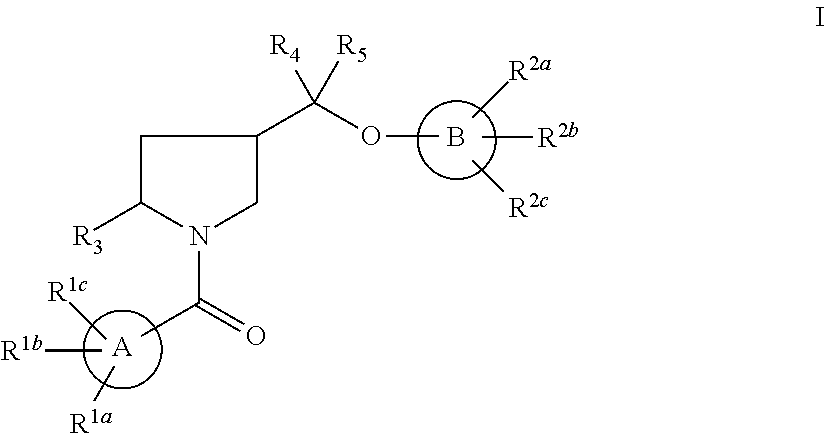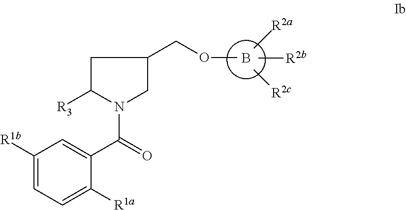 - An embodiment of the present invention includes compounds wherein heteroaryloxymethyl group is in the R configuration on the pyrrolidine ring.