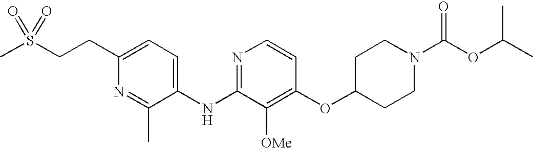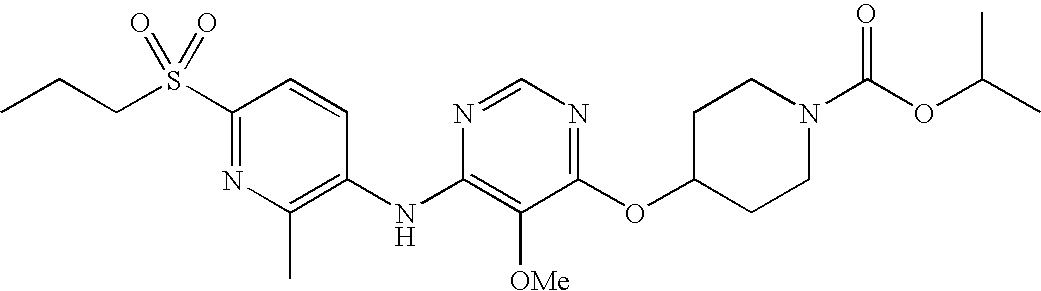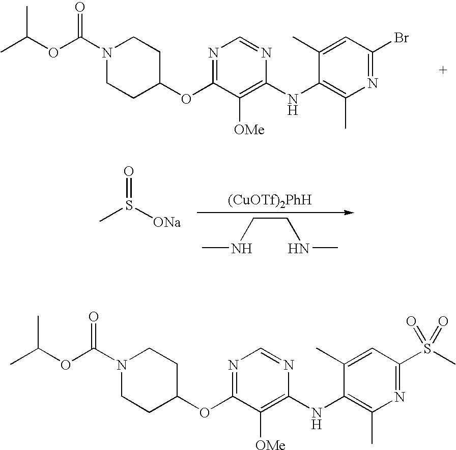 A mixture of isopropyl 4-(6-chloro-5-methoxypyrimidin-4-yloxy)piperidine-1-carboxylate (78.5 mg, 0.238 mmol), 2-methyl-6-(2-(methylsulfonyl)propan-2-yl)pyridin-3-amine (54.3 mg, 0.238 mmol), Pd2(dba)3 (20.0 mg, 0.0218 mmol), biphenyl-2-yl-di-tert-butyl-phosphane (3.0 mg, 0.0101 μmol), and cesium carbonate (160 mg, 0.491 mmol) in 4M dioxane were heated under microwave irradiation at 100° C. Mixture was purified by HPLC; fractions containing product were partly concentrated, and residue was extracted with CH2Cl2 and 1M NaHCO3. Organic phases were dried over MgSO4, filtered, and concentrated to give isopropyl 4-(5-methoxy-6-(2-methyl-6-(2-(methylsulfonyl)propan-2-yl)pyridin-3-ylamino)pyrimidin-4-yloxy)piperidine-1-carboxylate (4.6 mg, 4%) as a white solid. 1HNMR (CDCl3, 400 MHz) δ 1.16-1.17 (d, J=6.3 Hz, 6H), 1.80-1.86 (m, 2H), 1.87 (s, 6H), 2.01-2.06 (m, 2H), 2.56 (s, 3H), 2.81 (s, 3H), 3.38-3.44 (m, 2H), 3.77-3.82 (m, 2H), 3.96 (s, 3H), 4.91-4.97 (m, 1H), 5.35-5.39 (m, 1H), 6.98 (s, 1H), 7.51-7.53 (d, J=8.6 Hz, 1H), 8.13 (s, 1H), 8.51-8.53 (d, J=8.6 Hz, 1H). Exact mass calculated for C24H35N5O6S 521.23 found 522.5 (MH+).