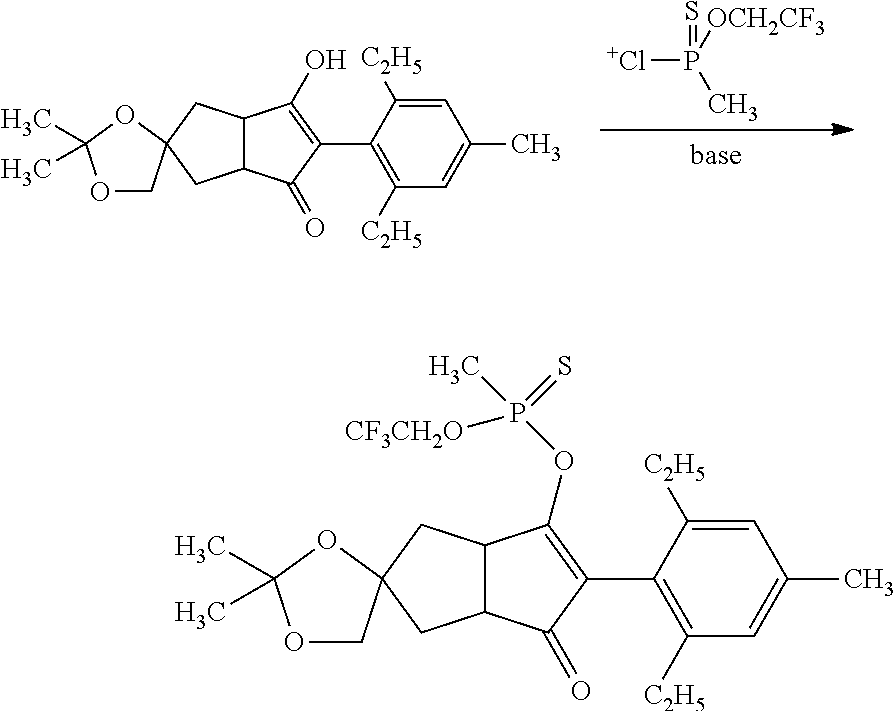 - JYLAJRQVPUXVQN-UHFFFAOYSA-N C=O.CCC1=CC(C)=CC(CC)=C1C1=C(O)C2CC3(COC(C)(C)O3)CC2C1=O.CCC1=CC(C)=CC(CC)=C1C1=C(OP(C)(=S)C(F)(F)F)C2CC3(COC(C)(C)O3)CC2C1=O.CP(=S)([ClH+])OCC(F)(F)F Chemical compound C=O.CCC1=CC(C)=CC(CC)=C1C1=C(O)C2CC3(COC(C)(C)O3)CC2C1=O.CCC1=CC(C)=CC(CC)=C1C1=C(OP(C)(=S)C(F)(F)F)C2CC3(COC(C)(C)O3)CC2C1=O.CP(=S)([ClH+])OCC(F)(F)F JYLAJRQVPUXVQN-UHFFFAOYSA-N 0.000 description 1