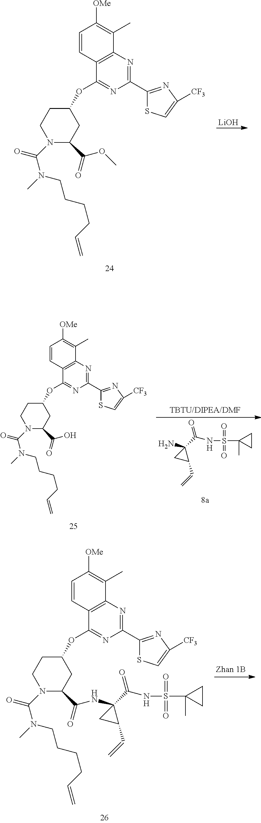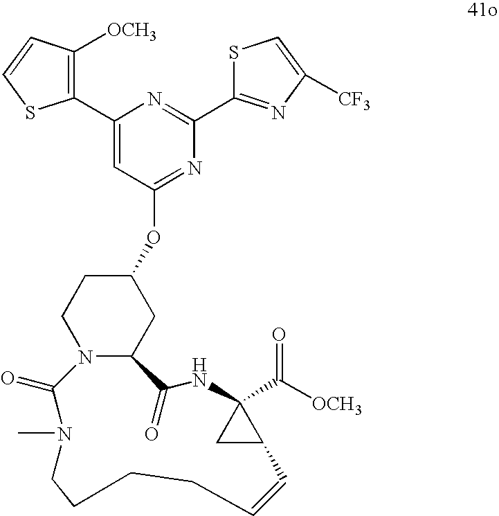 Inhibitors of HCV NS3 protease that have been reported include linear and cyclic peptides and peptide mimetics, and non-peptide molecules (Llinàs-Brunet et al., Bioorg. Med. Chem. Lett. 1998, 8, 1713-1718; Steinkühler et al., Biochemistry 1998, 37, 8899-8905; U.S. Pat. Nos. 5,538,865; 5,990,276; 6,143,715; 6,265,380; 6,323,180; 6,329,379; 6,410,531; 6,420,380; 6,534,523; 6,608,027; 6,642,204; 6,653,295; 6,727,366; 6,838,475; 6,846,802; 6,867,185; 6,869,964; 6,872,805; 6,878,722; 6,908,901; 6,911,428; 6,995,174; 7,012,066; 7,041,698; 7,091,184; 7,169,760; 7,176,208; 7,208,600; and 7,491,794; U.S. Pat. Appl. Publ. Nos.: 2002/0016294, 2002/0016442; 2002/0032175; 2002/0037998; 2004/0229777; 2005/0090450; 2005/0153877; 2005/176648; 2006/0046956; 2007/0021330; 2007/0021351; 2007/0049536; 2007/0054842; 2007/0060510; 2007/0060565; 2007/0072809; 2007/0078081; 2007/0078122; 2007/0093414; 2007/0093430; 2007/0099825; 2007/0099929; 2007/0105781, 2008/0152622, 2009/0035271, 2009/0035272, 2009/0111969, 2009/0111982, 2009/0123425, 2009/0130059, 2009/148407, 2009/0156800, 2009/0169510, 2009/0175822, and 2009/0180981; and International Pat. Appl. Publ. Nos.: WO 98/17679; WO 98/22496; WO 99/07734; WO 00/09543; WO 00/59929; WO 02/08187; WO 02/08251; WO 02/08256; WO 02/08198; WO 02/48116; WO 02/48157; WO 02/48172; WO 02/60926; WO 03/53349; WO 03/64416; WO 03/64455; WO 03/64456; WO 03/66103; WO 03/99274; WO 03/99316; WO 2004/032827; WO 2004/043339; WO 2005/037214; WO 2005/037860; WO 2006/000085; WO 2006/119061; WO 2006/122188; WO 2007/001406; WO 2007/014925; WO 2007/014926; WO 2007/015824, WO 2007/056120, WO 2008/019289, WO 2008/021960, WO 2008/022006, WO 2008/086161, WO 2009/053828, WO 2009/058856, WO 2009/073713, WO 2009/073780, WO 2009/080542, WO 2009/082701, WO 2009/082697, and WO 2009/085978). However, citation of any reference herein is not an admission that such reference is prior art to the present disclosure.