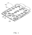 - coarse surfaces 1282 are formed on some of the number key holes 122 in the area of the second end 14 . The coarse surfaces 1282 reflect or refract the light rays in this area to guide light of the light source 20 to distant portions of the light guide plate 10 such as the number key holes 122 .
