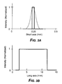 - FIG. 3A and FIG. 3B are idealized normalized intensity vs. distance (mm) plots for the idealized line image of FIG. 2 taken along the short-axis (scan) direction and the long-axis (cross-scan) direction, respectively, with the square (solid line) and Gaussian (dashed line) representing examples of idealized intensity profiles;