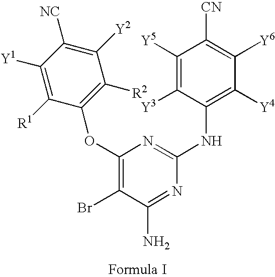 In another embodiment, any of the above methods of treatment comprises the further step of co-administering to said patient one or more second therapeutic agents. The choice of second therapeutic agent may be made from any second therapeutic agent known to be useful for co-administration with etravirine. The choice of second therapeutic agent is also dependent upon the particular disease or condition to be treated. Examples of second therapeutic agents that may be employed in the methods of this disclosure are those set forth above for use in combination compositions comprising a compound of this disclosure and a second therapeutic agent.