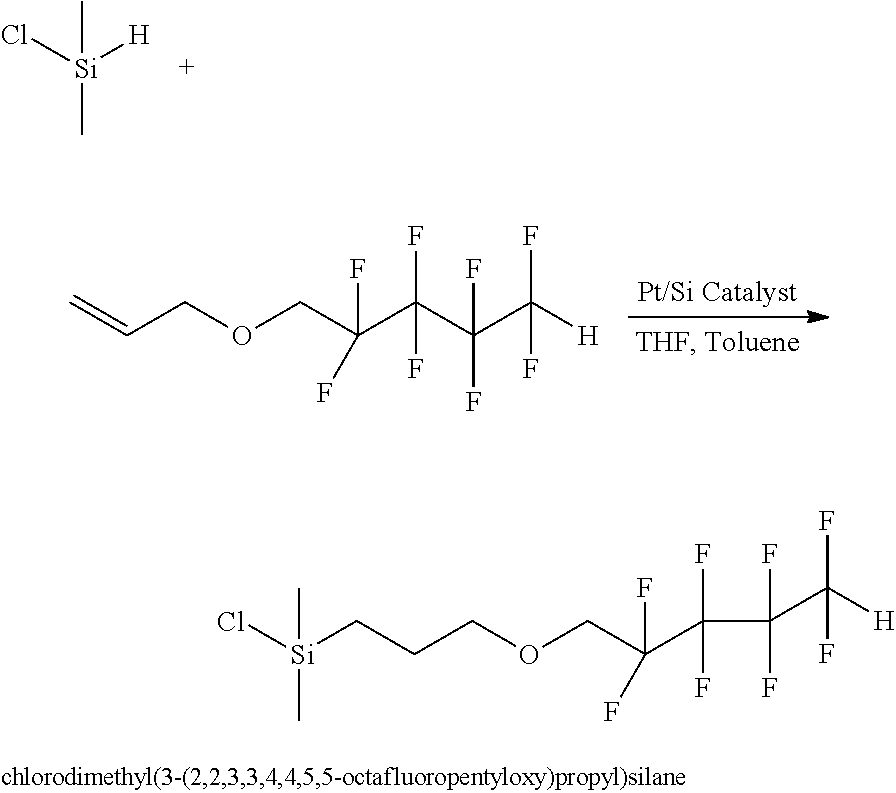 - SOJCZHKMKUJBTN-UHFFFAOYSA-N [H]C(F)(F)C(F)(F)C(F)(F)C(F)(F)COCC=C.[H]C(F)(F)C(F)(F)C(F)(F)C(F)(F)COCCC[Si](C)(C)Cl.[H][Si](C)(C)Cl Chemical compound [H]C(F)(F)C(F)(F)C(F)(F)C(F)(F)COCC=C.[H]C(F)(F)C(F)(F)C(F)(F)C(F)(F)COCCC[Si](C)(C)Cl.[H][Si](C)(C)Cl SOJCZHKMKUJBTN-UHFFFAOYSA-N 0.000 description 1