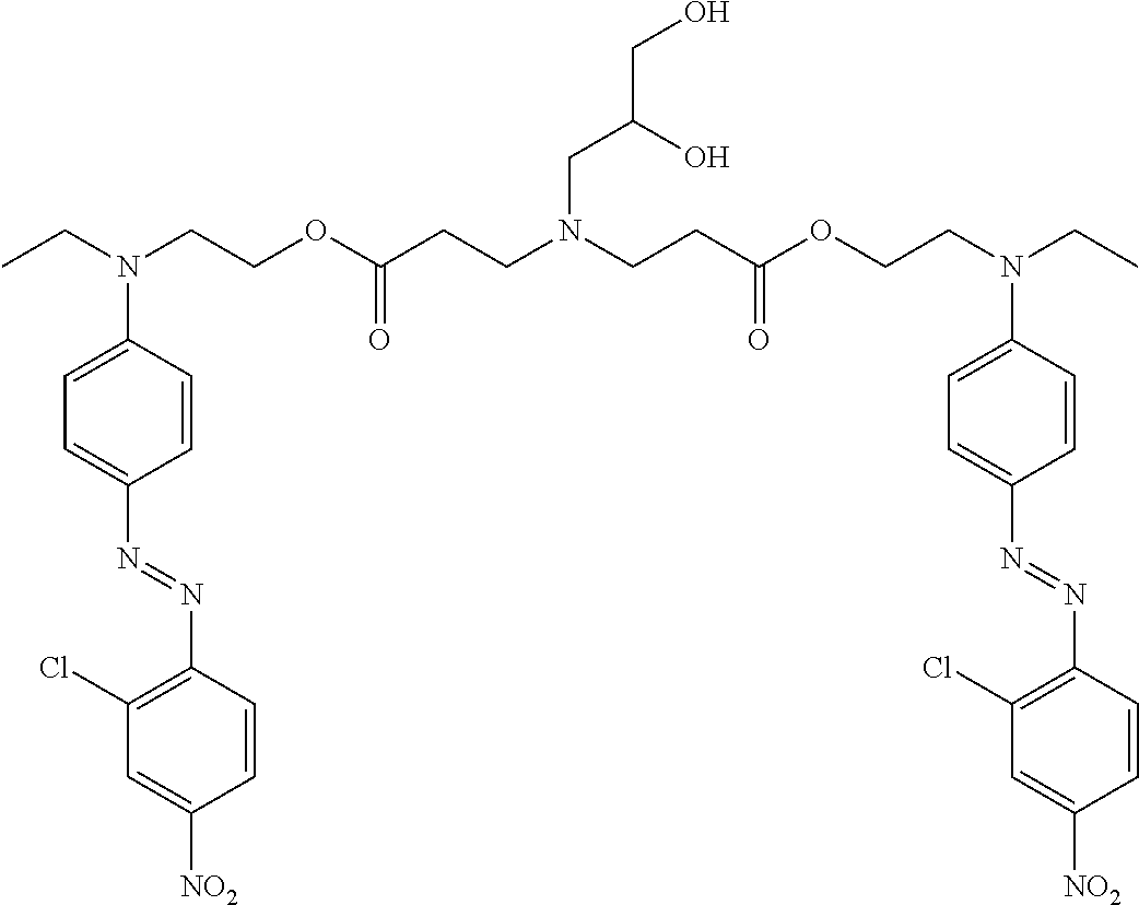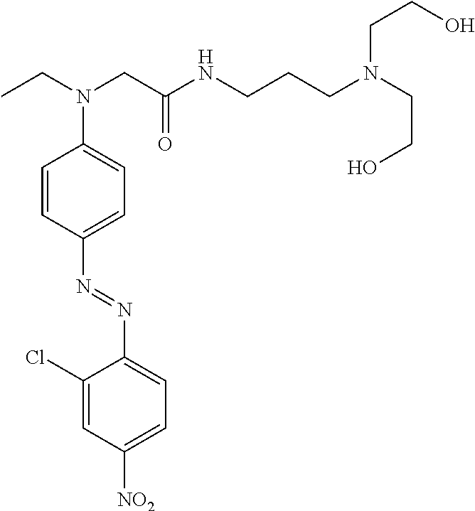 FIGS. 2 a and 2 b compare the color fastness of a commercially available red dye applied to increasingly damaged hair (FIG. 2 a) with the color fastness of compound A applied to tresses having the same damage (FIG. 2 b) immediately after application to hair and after 15 shampoo cycles. The left tress of each pair is the initial color while the right tress of each pair is the result after shampooing. The last tress in both 2 a and b does not have a shampooing pair (only the initial color was examined).