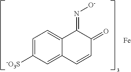 In a second assay to determine the effect of the dyes of the invention on damaged hair, virgin medium blond, single bleached (commercial), 3×40 V from virgin medium brown, platinum (commercial double bleached), 6×40 V from Virgin medium brown, and 9×40 V from virgin medium brown were (a) dyed with either the leading commercially available red dye (1 g of dye cream to 1 mL of 20V peroxide) for 30 minutes at room temperature or (b) treated with a blond commercially available kit such as L'Oréal Superior Preference 9½ NB or with a dyeless base prepared on site for 30 minutes at room temperature to “lift” the hair (e.g., make the hair more porous), followed by soaking in a 0.6% (w/w) solution of compound A in a 1:1 mixture of EtOH:phosphate buffer, pH 4.5 for 10 minutes at room temperature. The results, shown in FIG. 2, demonstrate that with increasing damage (moving from left to right across FIG. 2), the leading commercial red dye exhibits significant fading and color loss (FIG. 2 a). In contrast, the tresses dyed with compound A demonstrated an inverse color fastness to porosity property. That is, with increased damage to hair, compound A provided greater deposits of color and a greater color fastness compared to the leading commercially available red dye on similarly damaged hair.