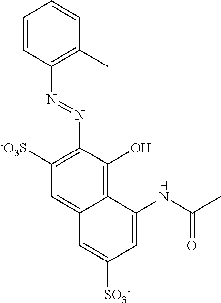 In other embodiments, the dye is a non-natural dye (e.g., a dye obtained from a natural source, for example, a plant, animal or mineral). Examples of dyes obtained from natural sources include, for example, indigo, carminic acid, lawsone (e.g., henna), lycopene, madder, monascus derivatives, santalin, annatto, apigenin, canthaxanthin, capsanthin, capsorubin, carotenes, carthamin, crocin, crocetin, curcumin, lutein, luteolin, pratol, caramel, cocoa, chlorophyll and indigo.