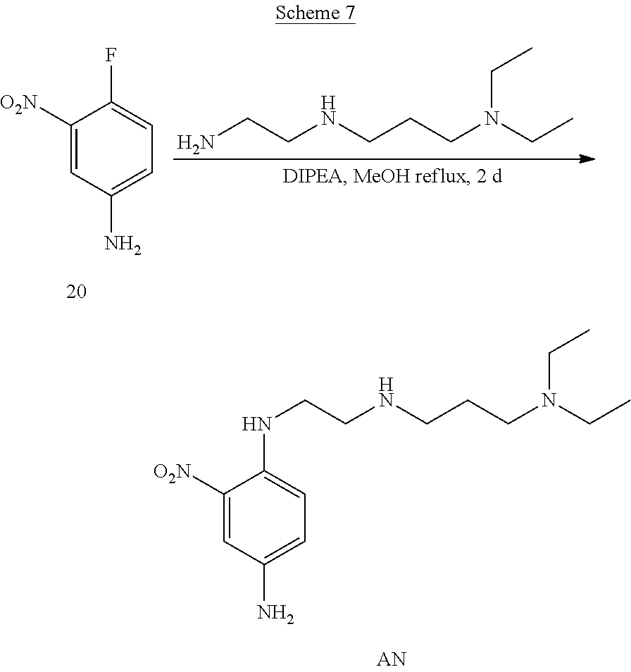 In some embodiments, T is NRl; M is NRm; Rl and Rm are each hydrogen; cc is 2 and dd is 3; Rj is NO2; Rk is hydrogen or NH2; Rn and Ro are each alkyl. In some embodiments, the alkyl is methyl, ethyl or hydroxyethyl.