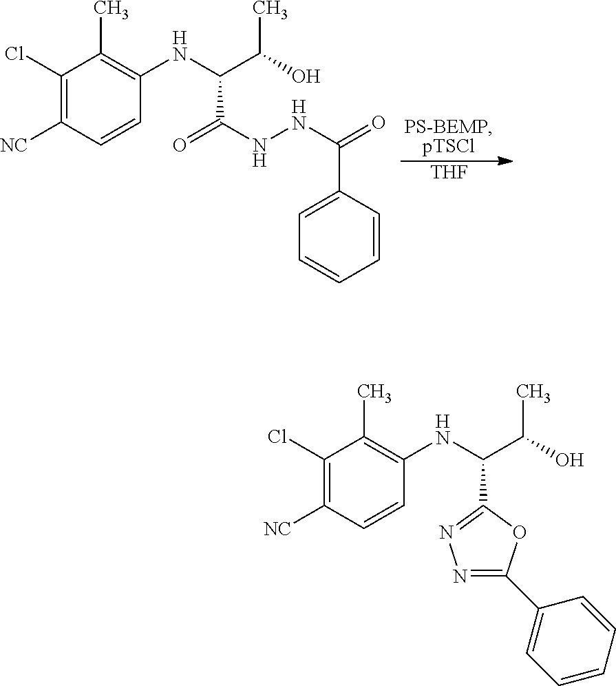 - FFHRXCFFUUDPML-MSYRUYIRSA-N C1CCOC1.C[C@H](O)[C@@H](NC1=CC=C(C#N)C(Cl)=C1Cl)C(=O)CNC(=O)C1=CC=CC=C1.C[C@H](O)[C@@H](NC1=CC=C(C#N)C(Cl)=C1Cl)C1=NN=C(C2=CC=CC=C2)O1 Chemical compound C1CCOC1.C[C@H](O)[C@@H](NC1=CC=C(C#N)C(Cl)=C1Cl)C(=O)CNC(=O)C1=CC=CC=C1.C[C@H](O)[C@@H](NC1=CC=C(C#N)C(Cl)=C1Cl)C1=NN=C(C2=CC=CC=C2)O1 FFHRXCFFUUDPML-MSYRUYIRSA-N 0.000 description 1