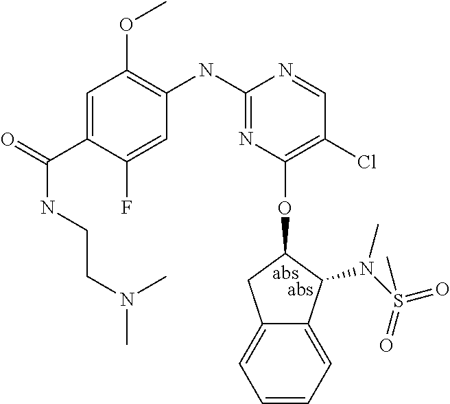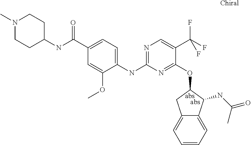 - MMTYIQYHTDOJGM-CLJLJLNGSA-N 4-methoxy-3-[[4-[[(1r,2r)-1-[methyl(methylsulfonyl)amino]-2,3-dihydro-1h-inden-2-yl]oxy]-5-(trifluoromethyl)pyrimidin-2-yl]amino]-n-(1-methylpiperidin-4-yl)benzamide Chemical compound C1=C(NC=2N=C(O[C@H]3[C@@H](C4=CC=CC=C4C3)N(C)S(C)(=O)=O)C(=CN=2)C(F)(F)F)C(OC)=CC=C1C(=O)NC1CCN(C)CC1 MMTYIQYHTDOJGM-CLJLJLNGSA-N 0.000 claims description 2